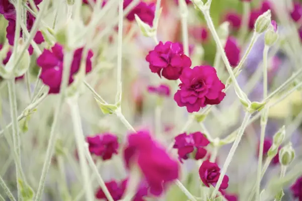 בחר נקודה שטופת שמש עבור הקאמפון האפורי-עלה, Lychnis Coronaria , עם הפרחים הצולבים הצולבים שלה המוחזקים על גבעולים זקופים בקיץ.