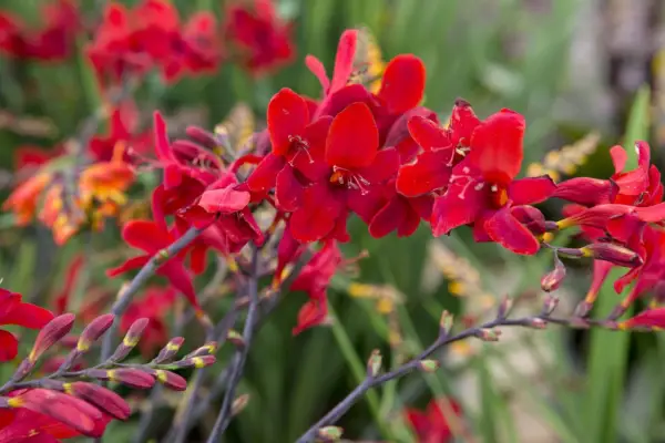 קרוסקוסמיה 'Hellfire' נושאת אשכולות צמודים של פרחי ארגמן עצומים ומוארים מאמצע הקיץ לסתיו. זה אידיאלי לגידול בשטחים דרך הגבול העשבוני, במיוחד בתכניות נטיעה חמות או טרופיות, והפרחים מצוינים לחיתוך.