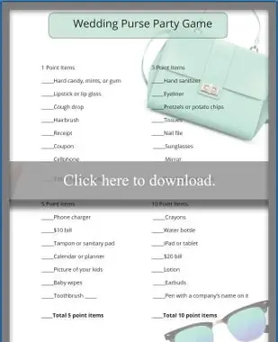 המשחק הזה מהיר וקל. כל אדם מוציא את הארנק ומקבל את הנקודות שהוקצו אם יש לה את הפריטים בתיק. הזמין פרס קטן לזוכה.