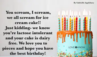- אתה צורח, אני צורח, כולנו צורחים עלעוגת גלידה!! רק צוחק - אנחנו יודעים שאתה לא סובלני ללקטוז והעוגה שלך אינה חלבית. אנחנו אוהבים אותך לחתיכות ומקווים שיהיה לך יום הולדת הכי טוב!