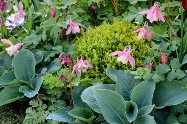 אקווילגיאס ורוד הגדל בגבול מעורב עם הוסטות ותיבה