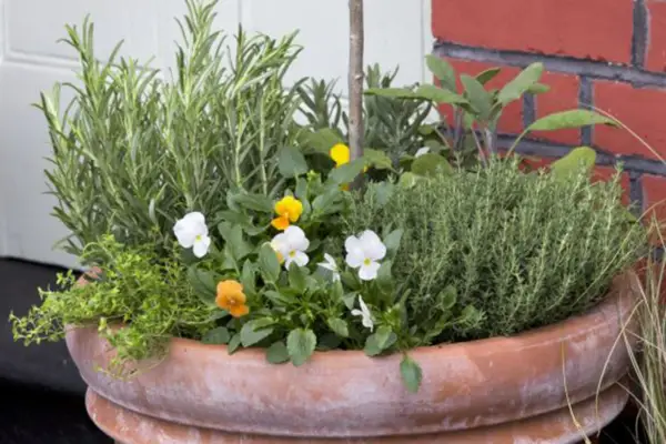 מקם את הפנסי, התימין ועשבי התיבול האחרים סביב הזית, ומאפשרים לטימין לשפוך מעבר לקצה. מלא כל פערים בקומפוסט ובמשרד. השקה את המכולה היטב ומאפשרים להתנקז.