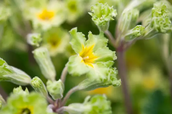 פוליאנטוס hybrid primulas are popular spring bedding plants, flowering in a range of colours from bright pink, purple and yellow to more sedate green.